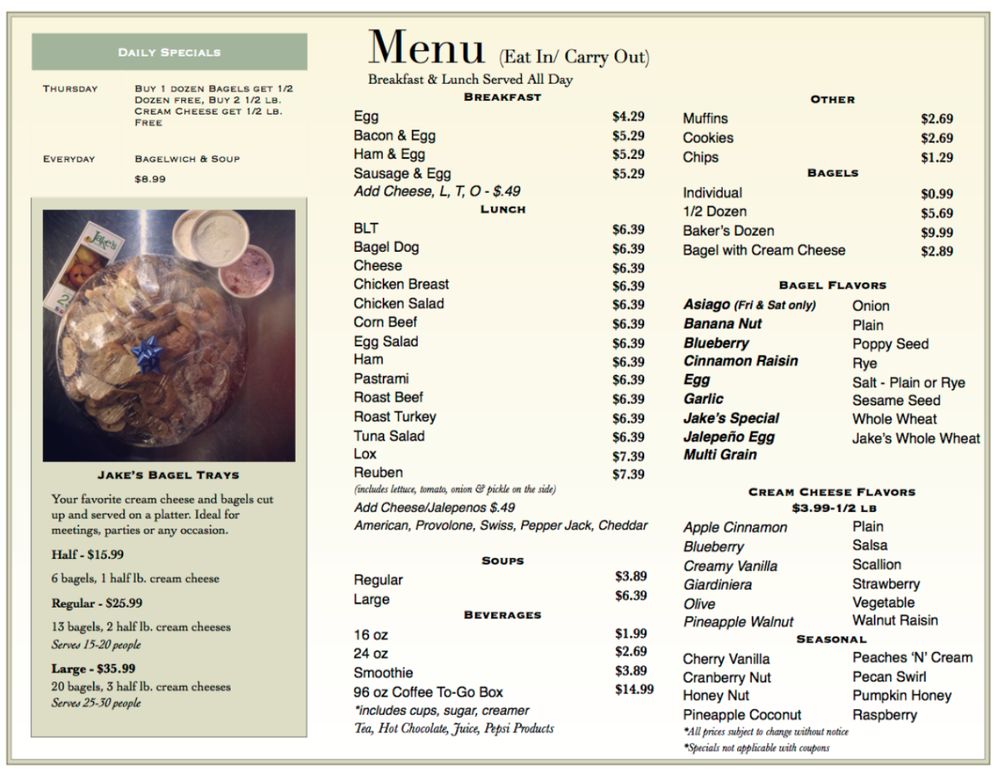 Beyond the food, Jake's Bagels offers a comfortable, casual atmosphere with ample indoor and outdoor seating. The staff is friendly and attentive, enhancing the overall dining experience. They provide various conveniences like takeout, delivery, and free Wi-Fi. Plus, their commitment to vegetarian options and accessibility ensures everyone is welcomed. Whether you're grabbing a quick bite or enjoying a leisurely brunch with friends and family, Jake's Bagels promises a warm and inviting experience!